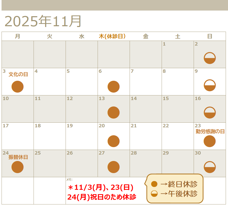 ★10/13(月)、11/3(月)、23(日)、24(月)祝日のため休診 ★10/19(日)臨時休診