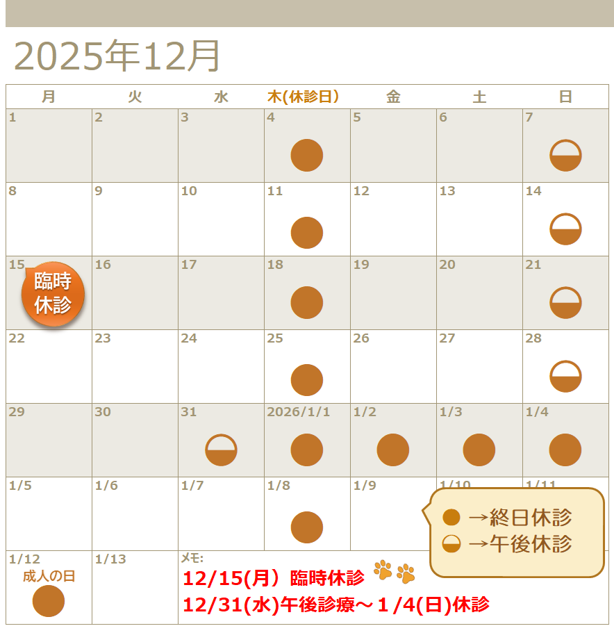 なお、年末年始は多くの動物病院がお休みになると思います。また、療法食や薬を扱ってらっしゃる業者さんもお休みになります。